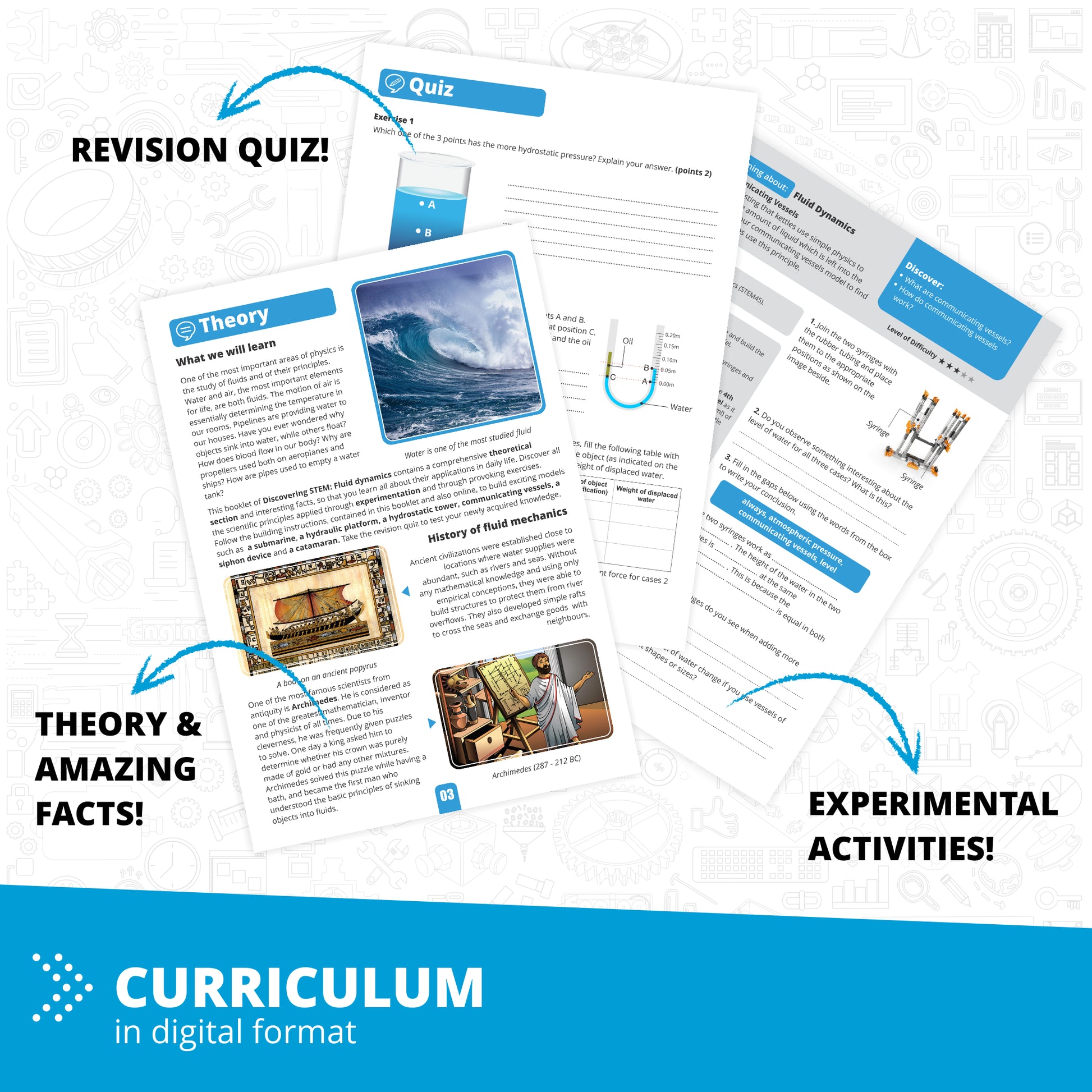 • Theory Booklet: Includes full background lessons on Archimedes’, Pascal’s, and Bernoulli’s principles, plus experiments, exercises, and quizzes.