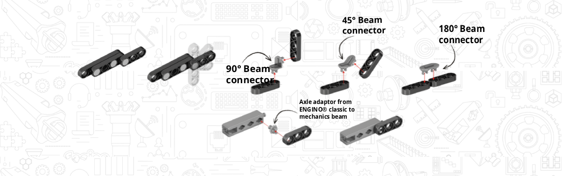 Beams can connect adjacently with each other, like bricks, by using our specially designed snap-fit axles, yet, they can be also be connected linearly at various angles using our new patented beam connectors! One of the biggest innovations of the ENGINO® Mechanics system is how the Beams can connect easily to the Classic System using the special axle-adaptors.