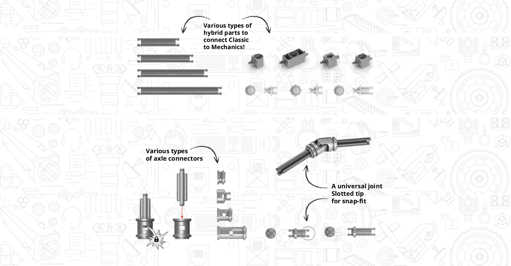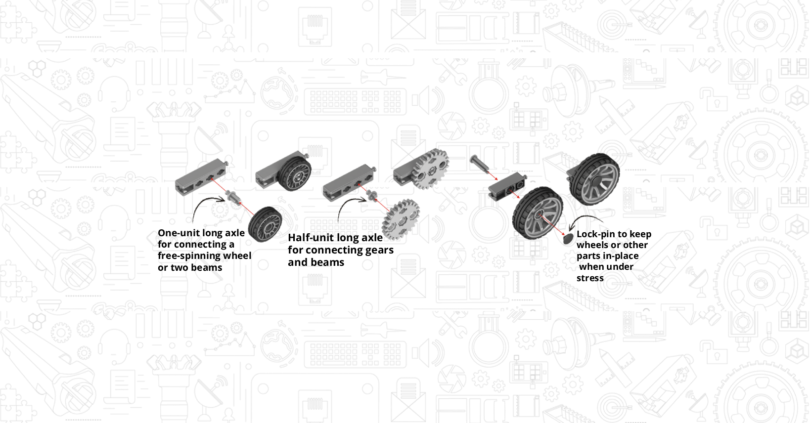 The new Mechanics system relies on axles to connect the various technical parts together. There are various axle sizes, with each one servicing a specific purpose and engineering application.When making technical models, it is important to transfer motion longer distances. For this purpose, we have developed a range of axle connectors that allow the axles to snap-in. These connectors have various sizes and will join axles linearly, extending them to the length required. There is even a special part to connect an axle vertically on beams!