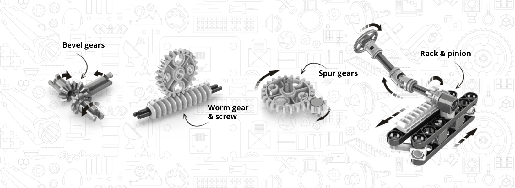 The new mechanics system of ENGINO® includes a range of high-precession gears that provide a smooth motion and transmit power from a hand-driven crank or the motor to another position, changing speed and torque based on the mechanical advantage of simple machines. There are 3 sizes of spur gears, a modular worm drive that can stack to itself achieving longer worms, a rack gear to convert rotational motion to linear and a set of bevel gears to change the direction of motion by 90 degrees. The central axle hub of the gears connects with a snap-fit with the various shafts of the system and is held secure in place with the use of the patented locking pin, making sure that gears will stay in place even when stressed with higher loads!