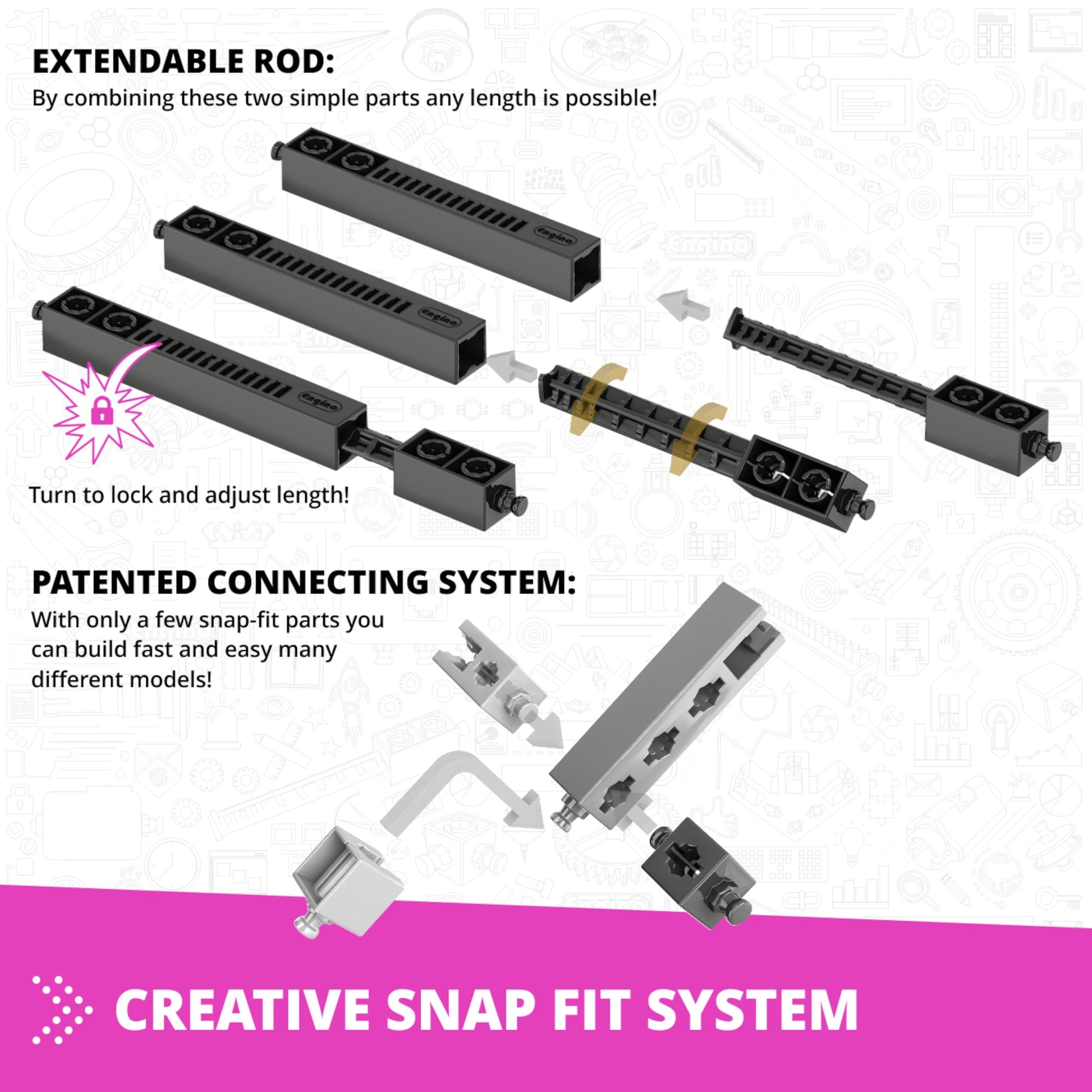 Score depends on the number of parts and connecting points The ENGINO building system has a patented design of the parts which allows connectivity of up to 6 sides simultaneously, while the unique extendable components lead to builds that were previously unthinkable, unleashing kids' creativity and imagination. Sets include printed step-by-step instructions for the main models, but also online through our kidCAD™ interactive app.