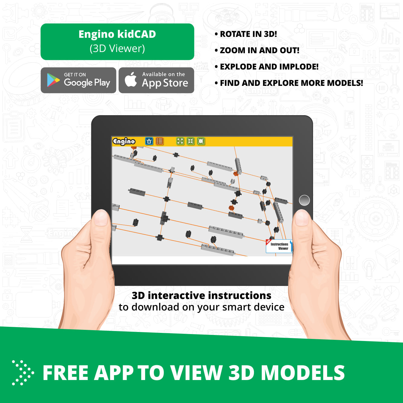 • Printed instructions for 1 model and 10 online kidCAD (3D Viewer) builds to rotate/zoom/explode views for easier assembly.