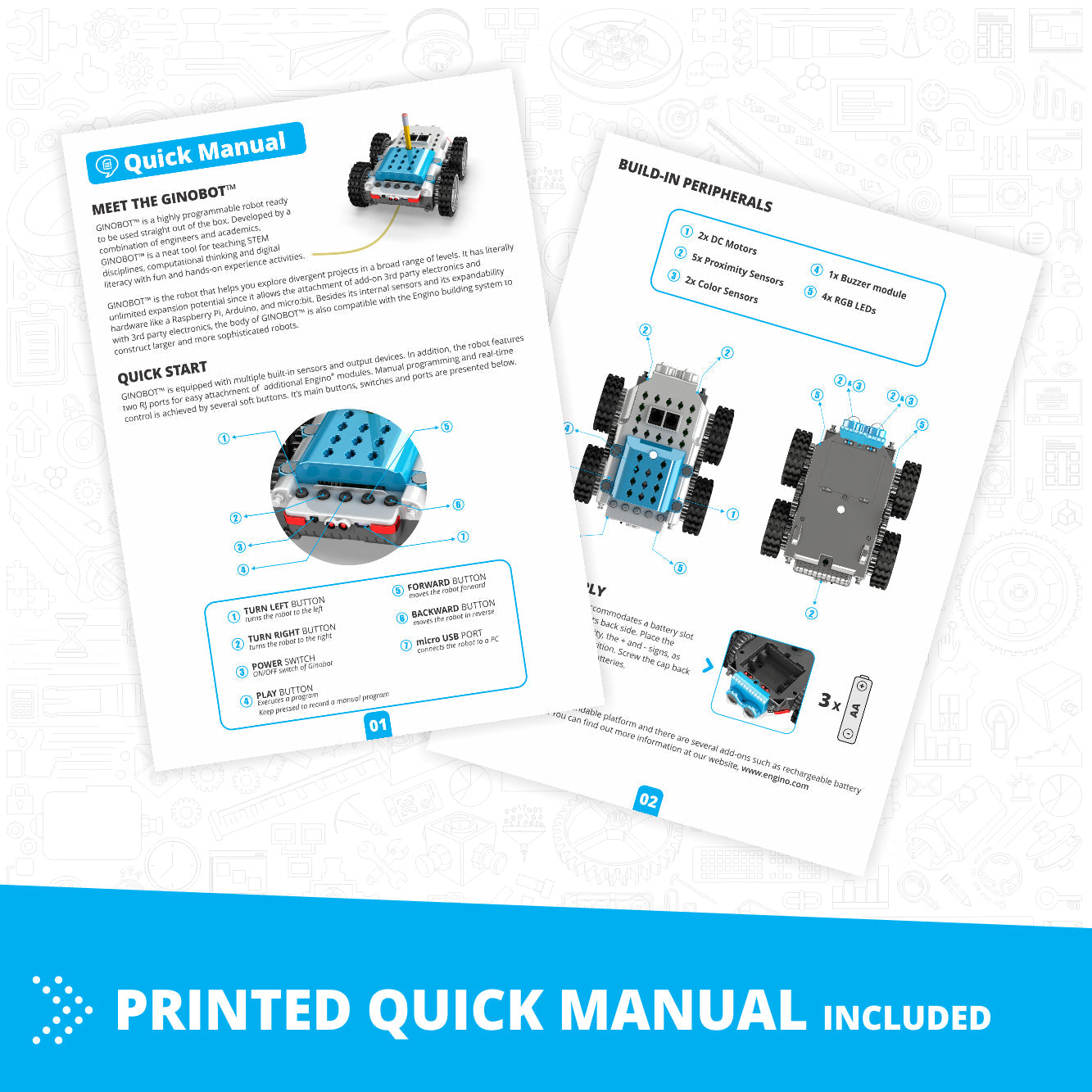 • Power & control built in: GinoBot® system with Bluetooth control and coding via KEIRO™; requires 3× AAA or Engino® rechargeable battery (not included).