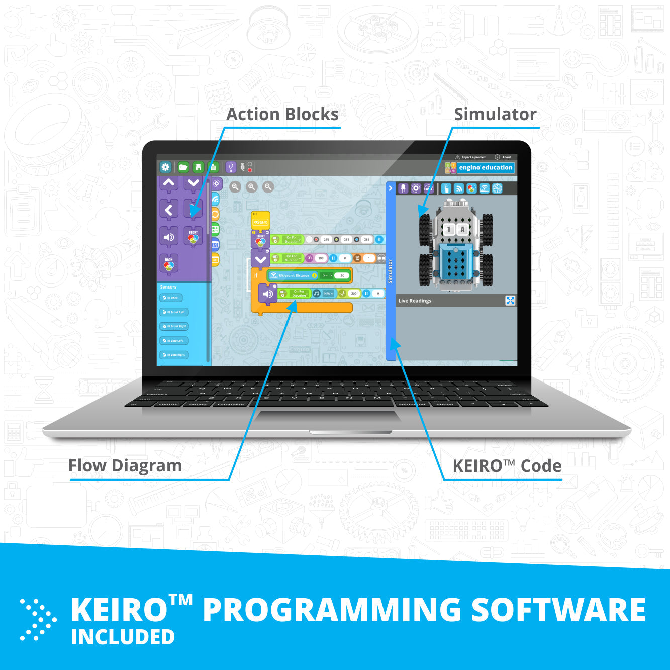Score depends on sensor's type and quantity Real robots need a controller with microprocessor and sensor inputs and ® various outputs. ENGINO 's patenting methodology of teaching coding starts with manual programming, moves on to virtual simulation, then to drag& drop flow diagrams and even to textual programming, powered by our KEIRO™ and ENVIRO™ software.
