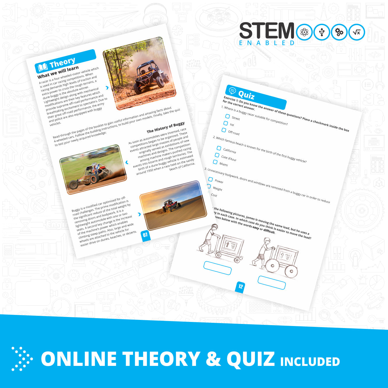 Score depends on amount of STEM/STEAM theory Even though theory learning is often limited to a sterile, mechanical memorization of textbooks, with ® ENGINO kids are engaged through colorful content enriched with interesting facts about the underlying technology which drives the models of each set.