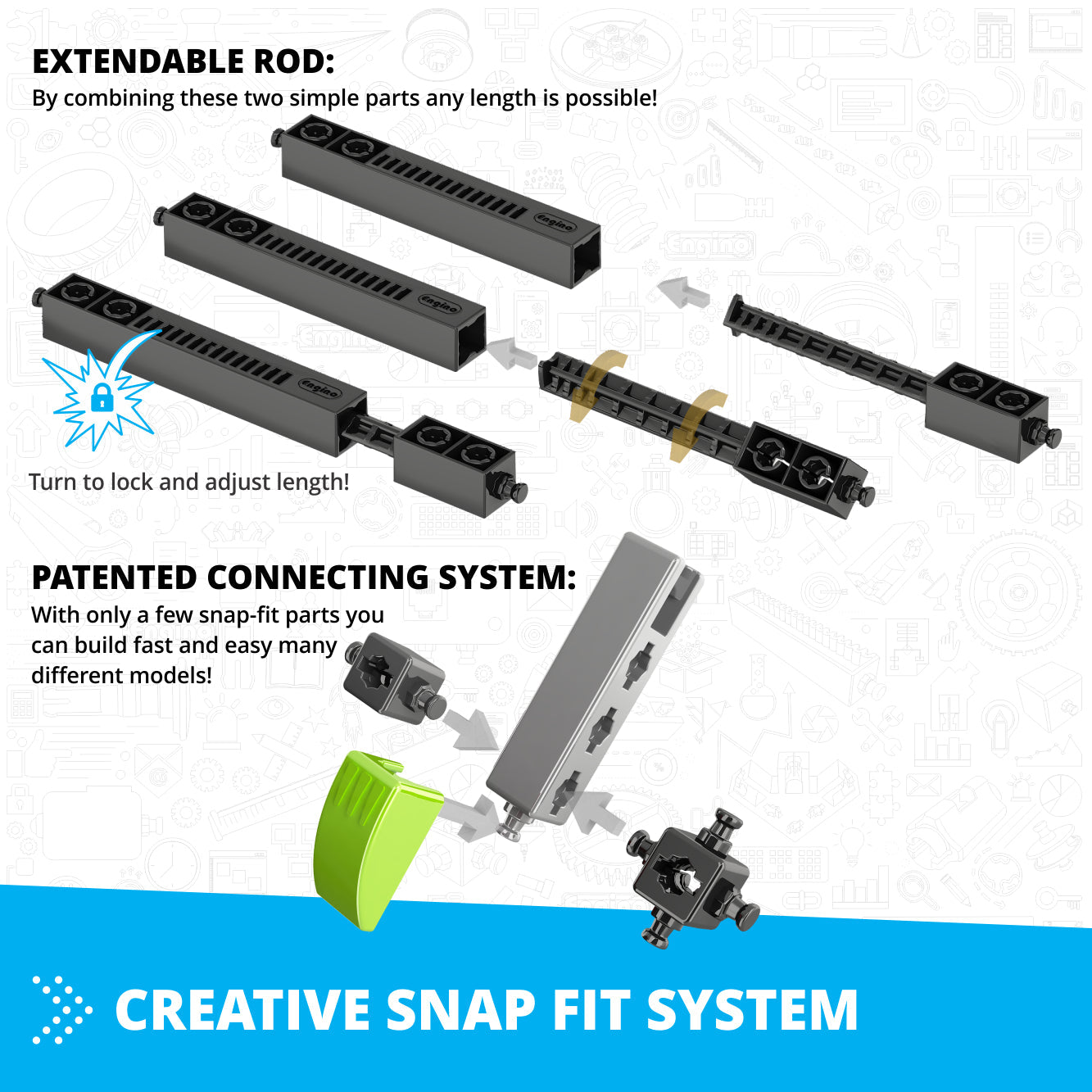 Score depends on the number of parts and connecting points The ENGINO building system has a patented design of the parts which allows connectivity of up to 6 sides simultaneously, while the unique extendable components lead to builds that were previously unthinkable, unleashing kids' creativity and imagination. Sets include printed step-by-step instructions for the main models, but also online through our kidCAD™ interactive app.