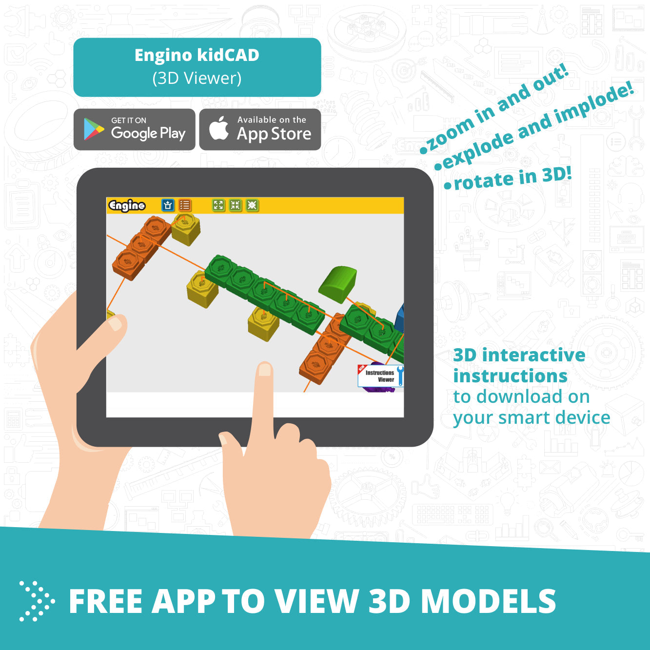 • kidCAD 3D Viewer app with AR preview: Rotate/zoom steps; improves dexterity and 3D perception. Also, tap AR in the 3D viewer to drop any STEAM Labs (STL) model into your room for true-to-scale guidance as you build.