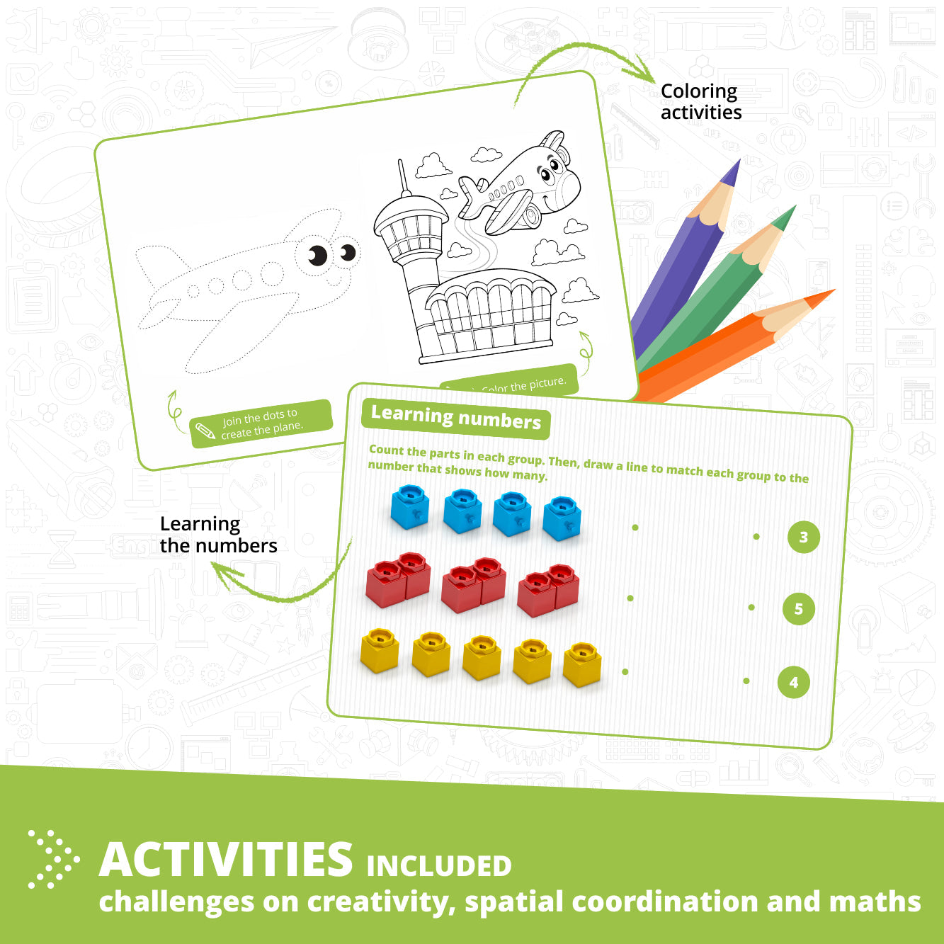 Children can construct a bright airplane as the main model, then transform the same pieces into 4 exciting bonus builds, from vehicles to imaginative creations.