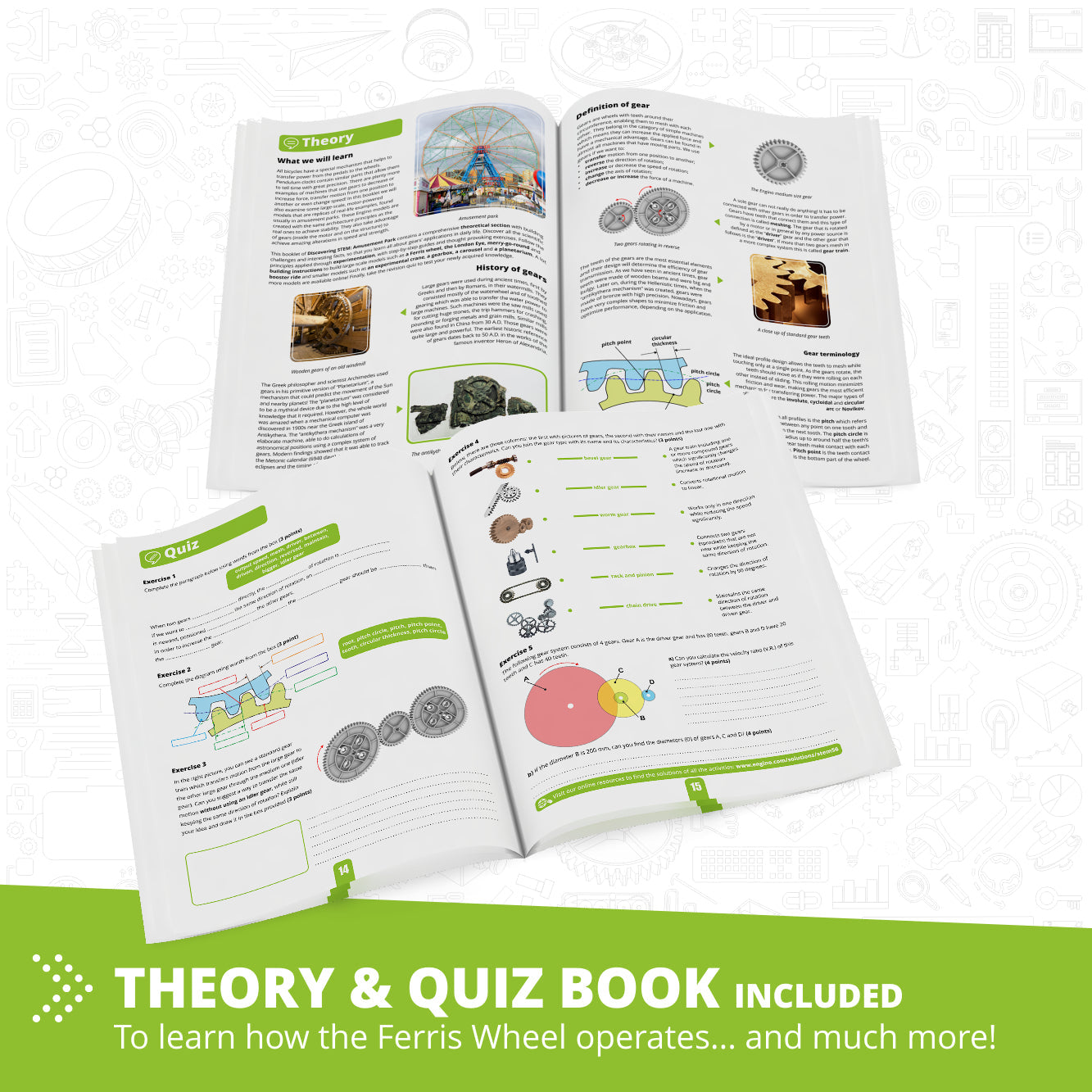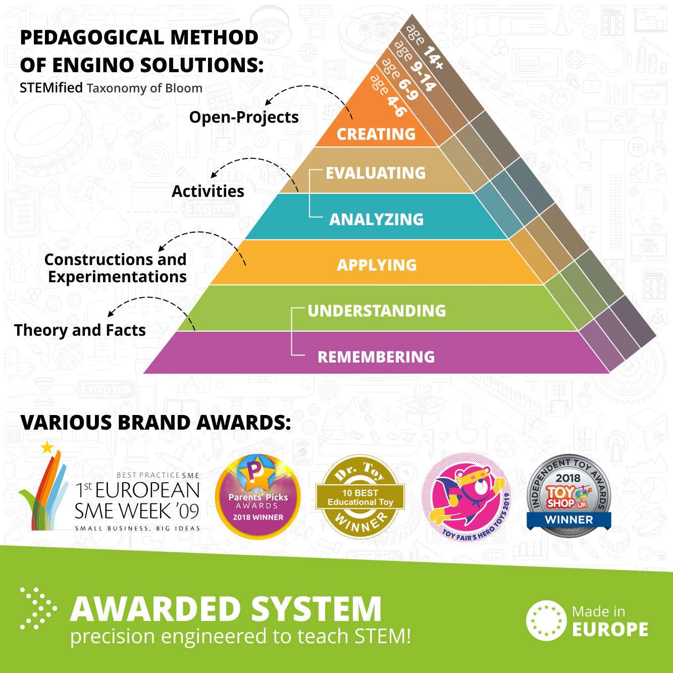 Score depends on amount of STEM/STEAM theory Even though theory learning is often limited to a sterile, mechanical memorization of textbooks, with ® ENGINO kids are engaged through colorful content enriched with interesting facts about the underlying technology which drives the models of each set.