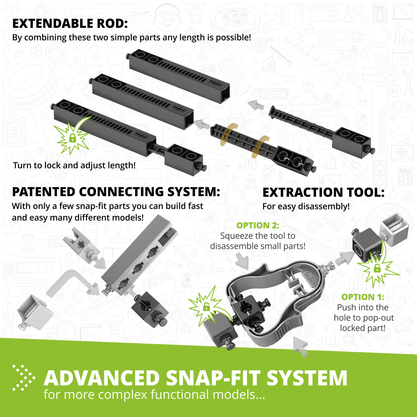 • Double-action extraction tool that enables quick & easy disassembly of small parts, helping kids iterate-and-improve builds.