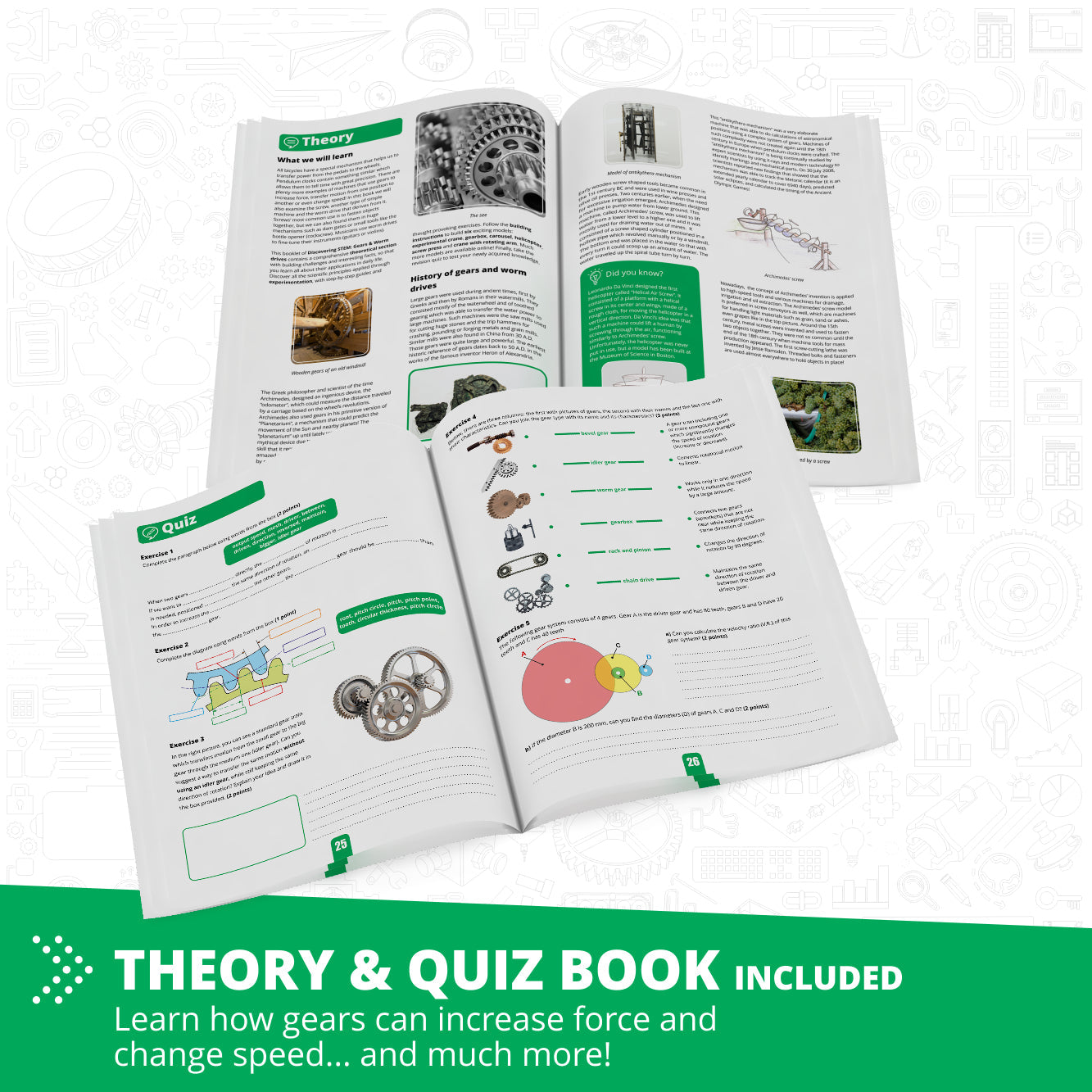 Structured theory, hands-on experiments, and quizzes guide learning, from a carousel speed study to a helicopter gear-train investigation. Build guidance is available in print and online, with a 3D viewer for error-proof assembly. Designed for young engineers to master gears & worm drives through play.