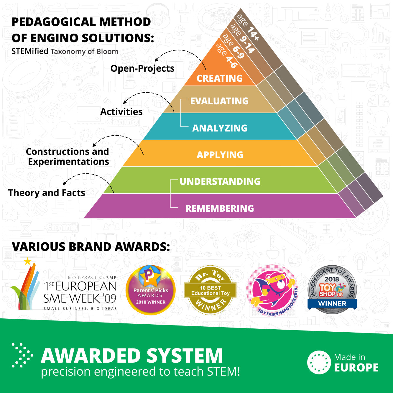 Score depends on amount of STEM/STEAM theory Even though theory learning is often limited to a sterile, mechanical memorization of textbooks, with ® ENGINO kids are engaged through colorful content enriched with interesting facts about the underlying technology which drives the models of each set.