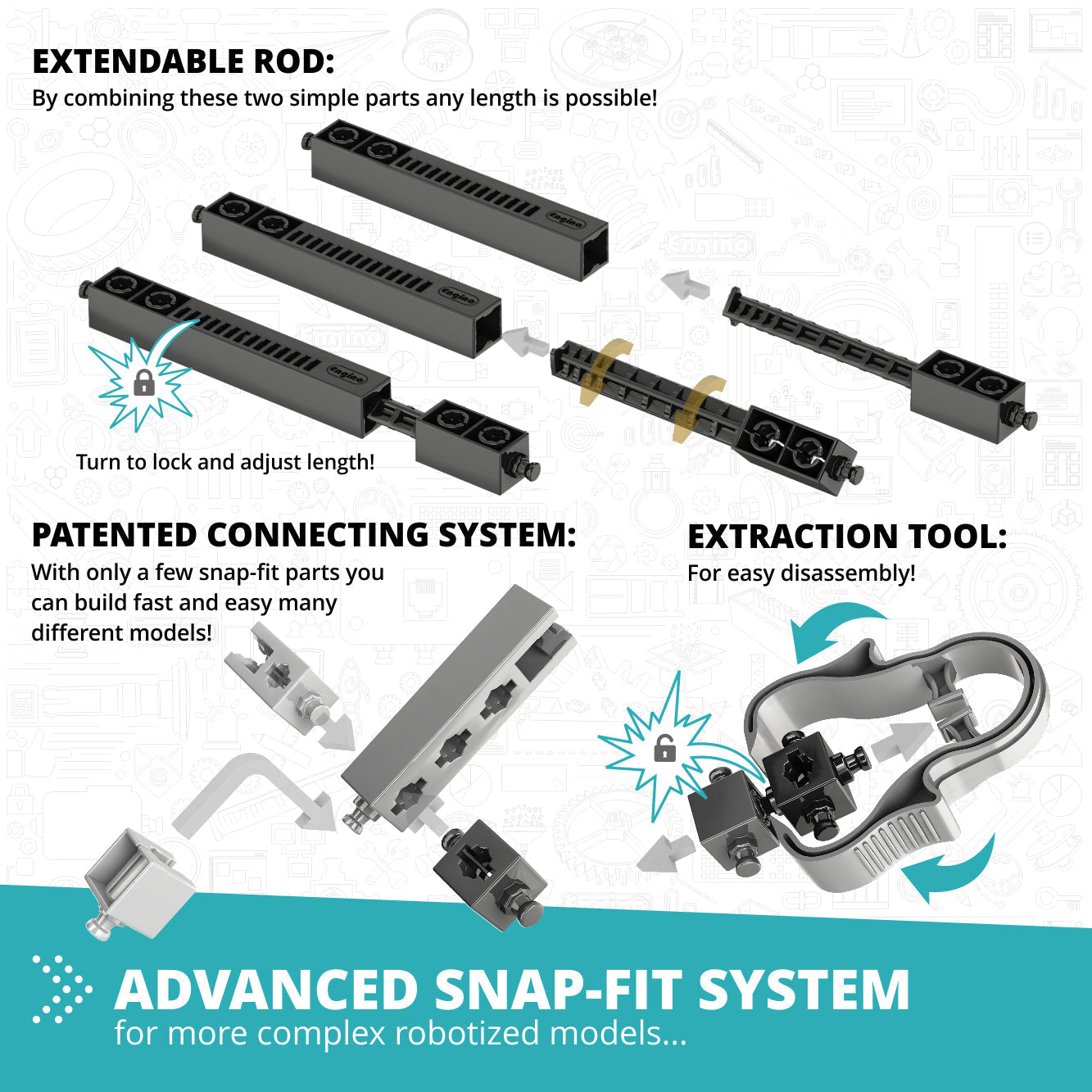 • 406 ENGINO® Structural Parts + 1,914 Connecting Points: Create stable, reconfigurable models using ENGINO’s patented 3D snap-fit system.