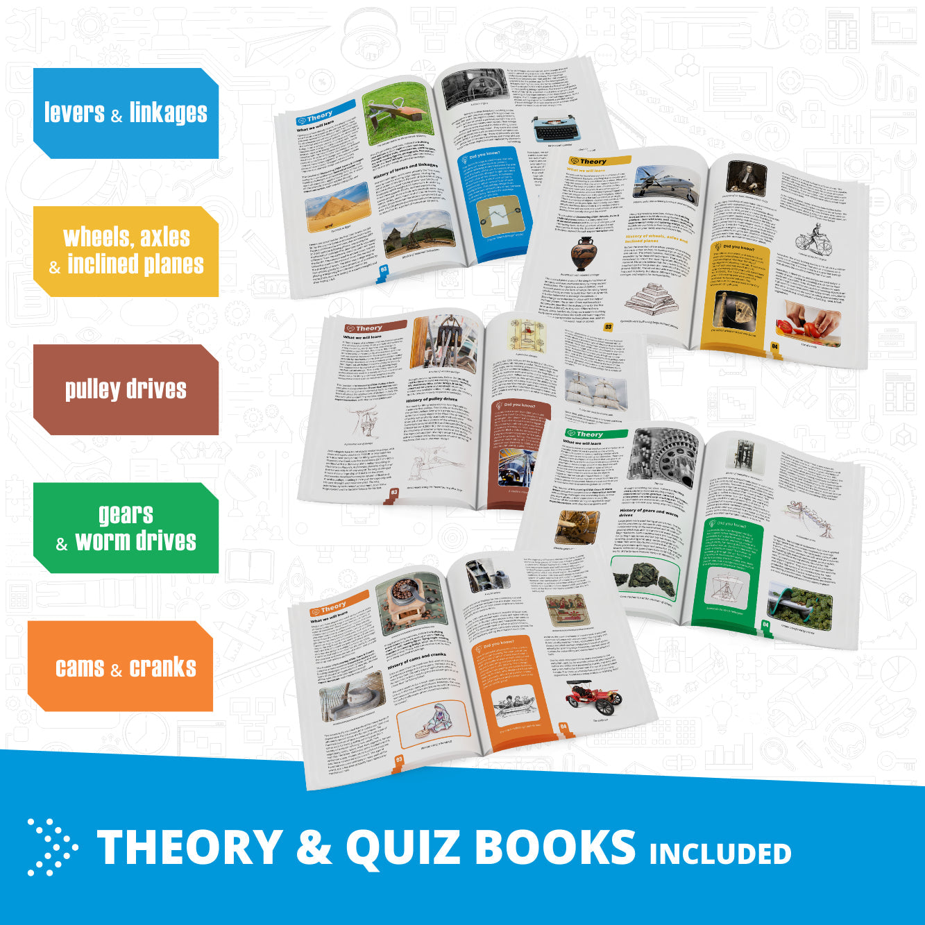 • Gears & Worm Drives: Build 12 models to understand gear ratios, torque, and changes in direction of motion.