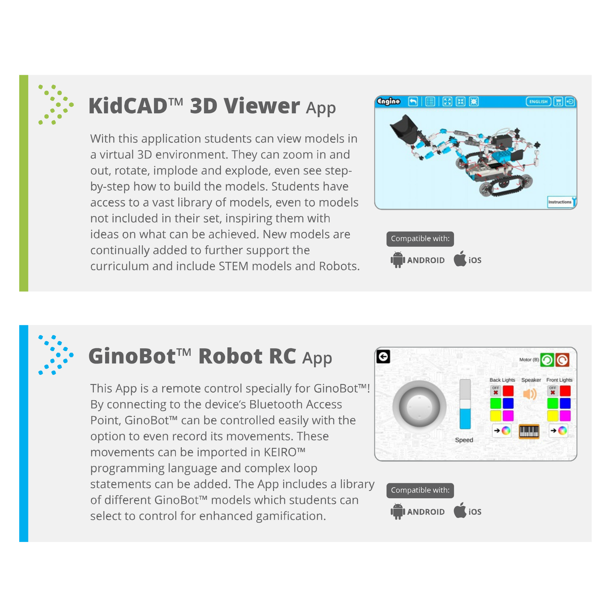 Η σουίτα λογισμικού ENGINO προσφέρει μια ολοκληρωμένη λύση εκπαίδευσης STEM, ξεκινώντας με το 3D Builder για ψηφιακή μοντελοποίηση και δεξιότητες CAD, προχωρώντας στο KEIRO™ για κωδικοποίηση βάσει μπλοκ και κειμένου, και στο ENVIRO™ για τρισδιάστατη προσομοίωση δεξιοτήτων προγραμματισμού χωρίς φυσικό υλικό.