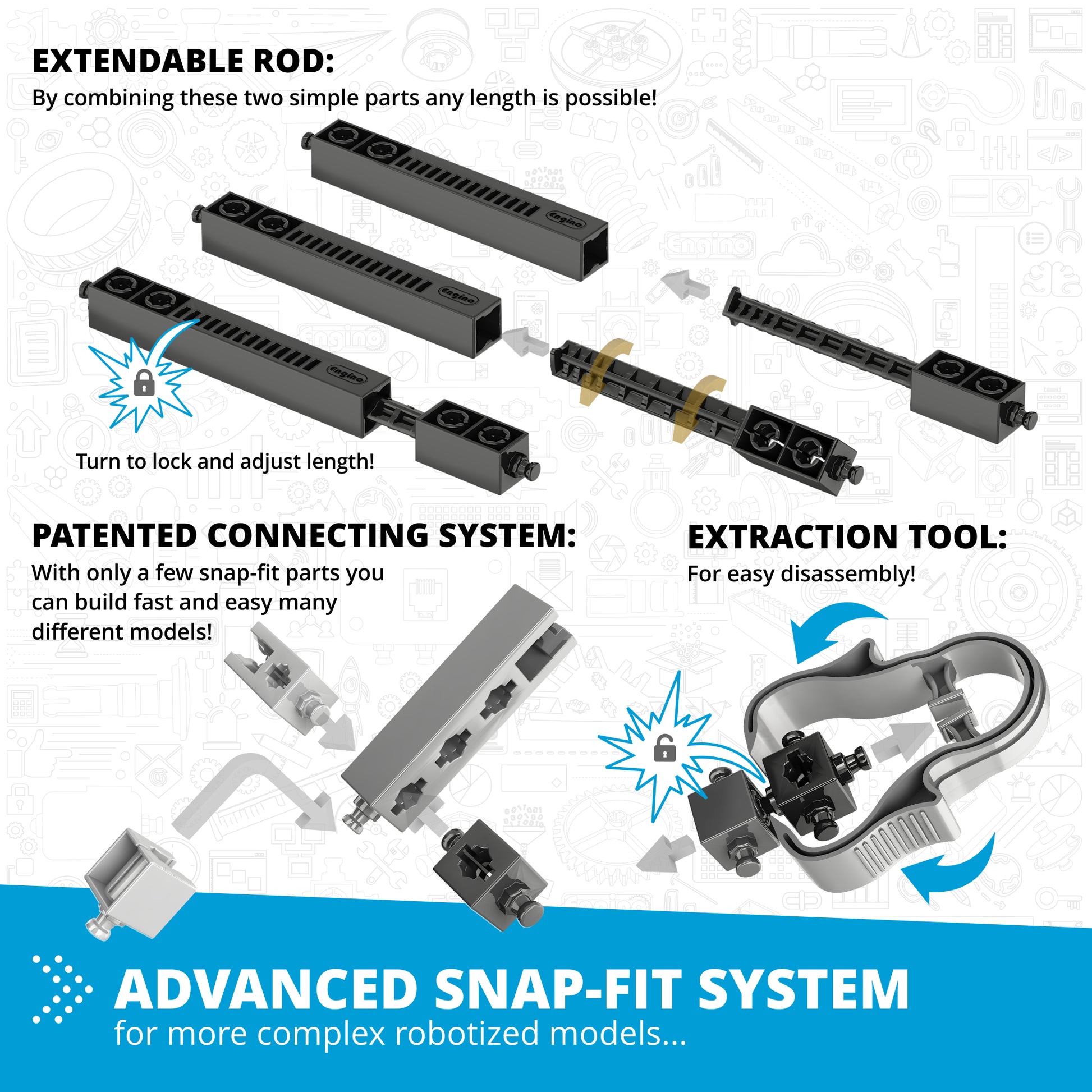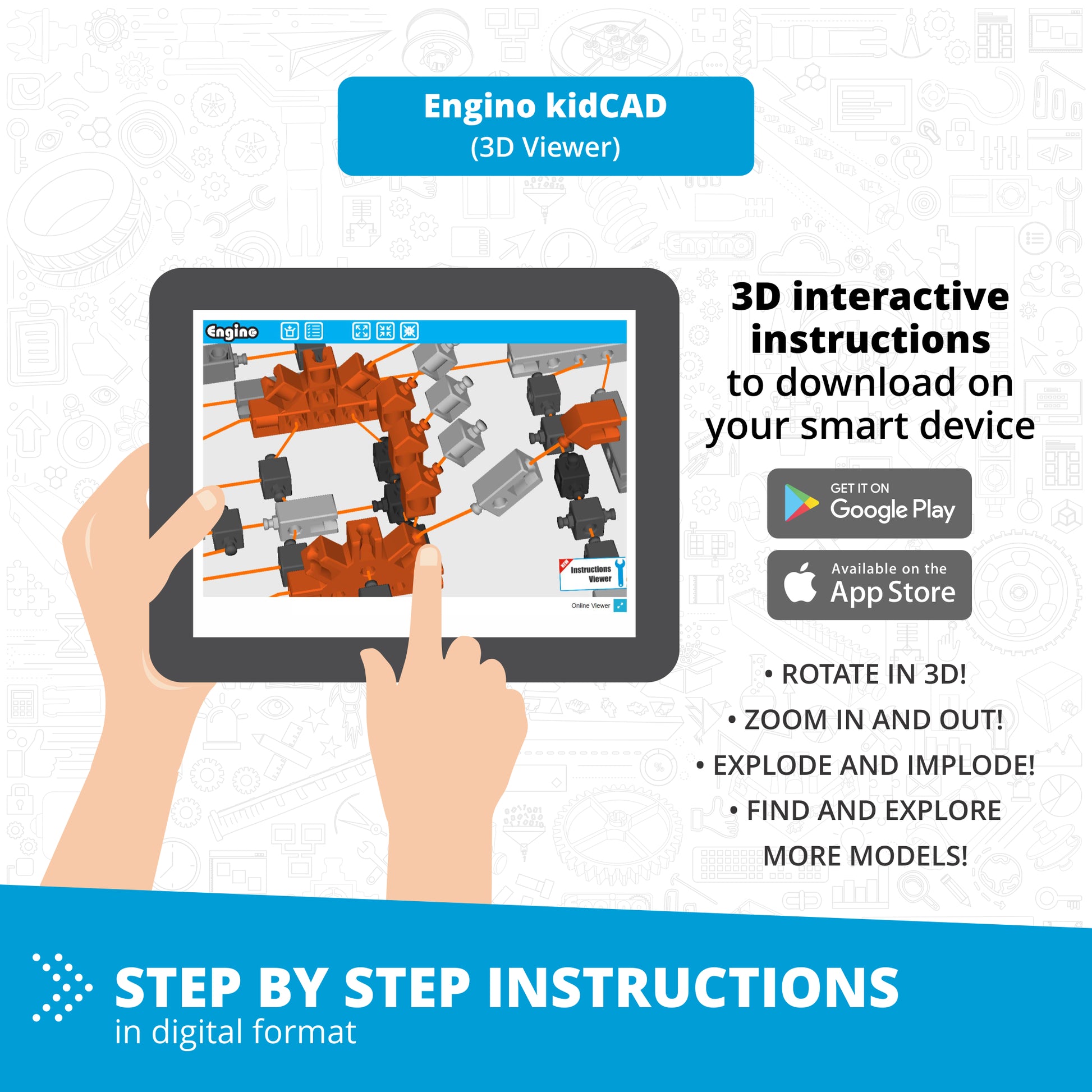 Score depends on the number of parts and connecting points The ENGINO building system has a patented design of the parts which allows connectivity of up to 6 sides simultaneously, while the unique extendable components lead to builds that were previously unthinkable, unleashing kids' creativity and imagination. Sets include printed step-by-step instructions for the main models, but also online through our kidCAD™ interactive app.