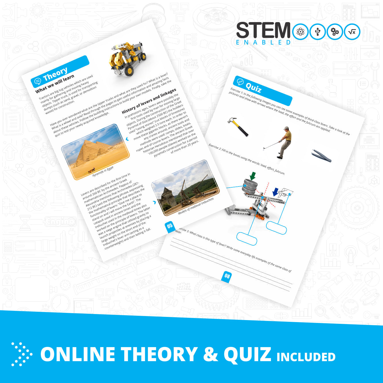 Score depends on amount of STEM/STEAM theory Even though theory learning is often limited to a sterile, mechanical memorization of textbooks, with ® ENGINO kids are engaged through colorful content enriched with interesting facts about the underlying technology which drives the models of each set.