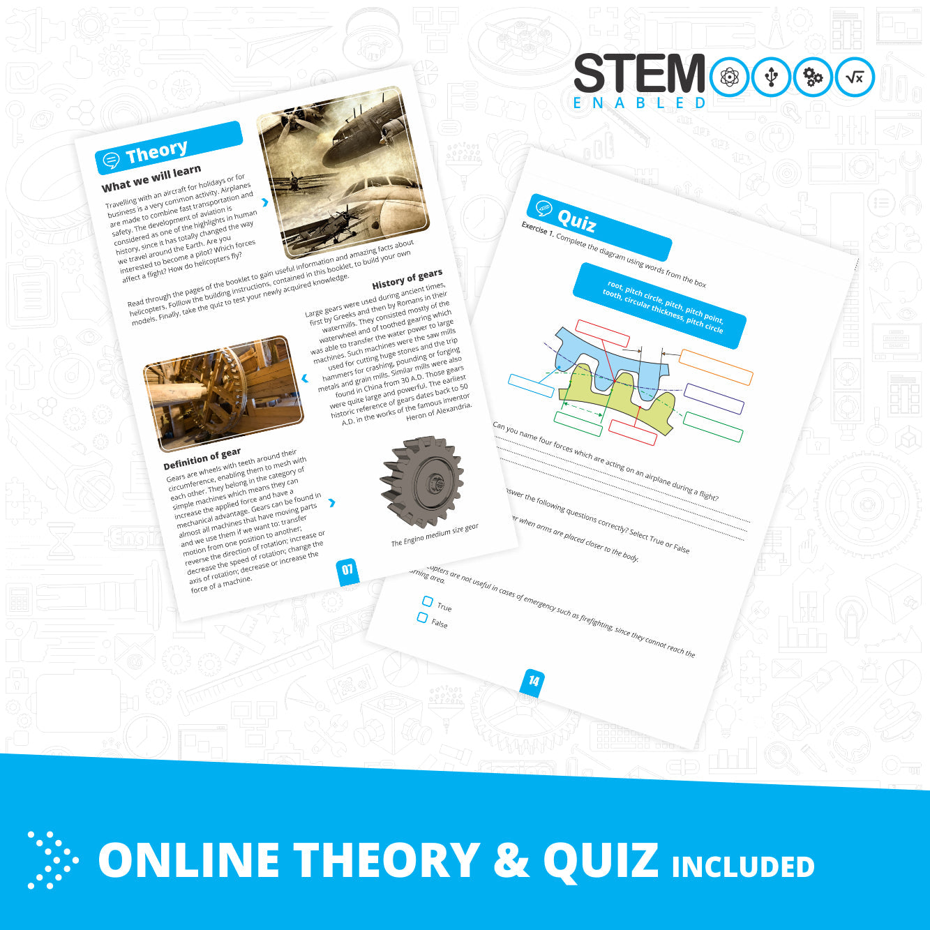 Score depends on amount of STEM/STEAM theory Even though theory learning is often limited to a sterile, mechanical memorization of textbooks, with ® ENGINO kids are engaged through colorful content enriched with interesting facts about the underlying technology which drives the models of each set.
