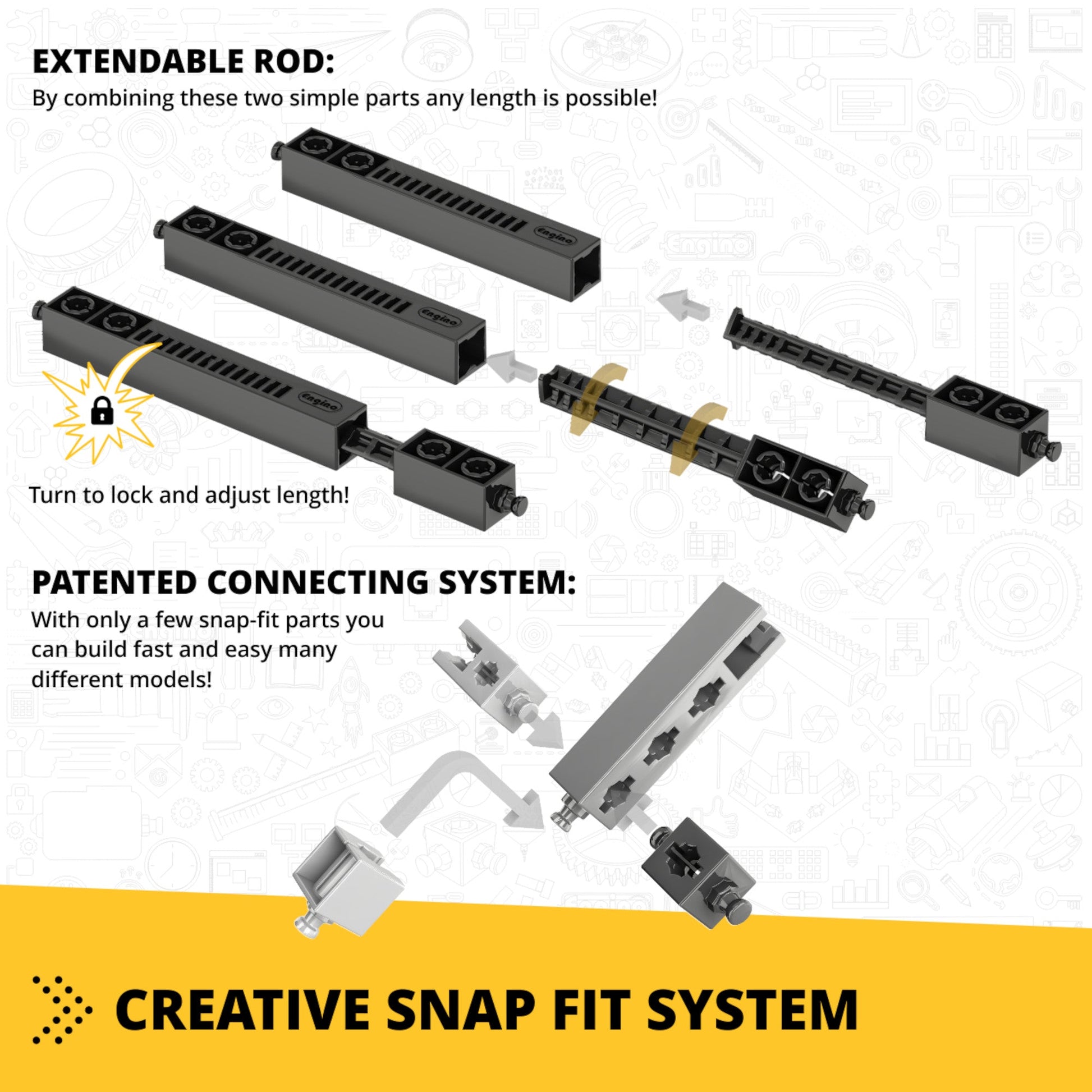 Score depends on the number of parts and connecting points The ENGINO building system has a patented design of the parts which allows connectivity of up to 6 sides simultaneously, while the unique extendable components lead to builds that were previously unthinkable, unleashing kids' creativity and imagination. Sets include printed step-by-step instructions for the main models, but also online through our kidCAD™ interactive app.
