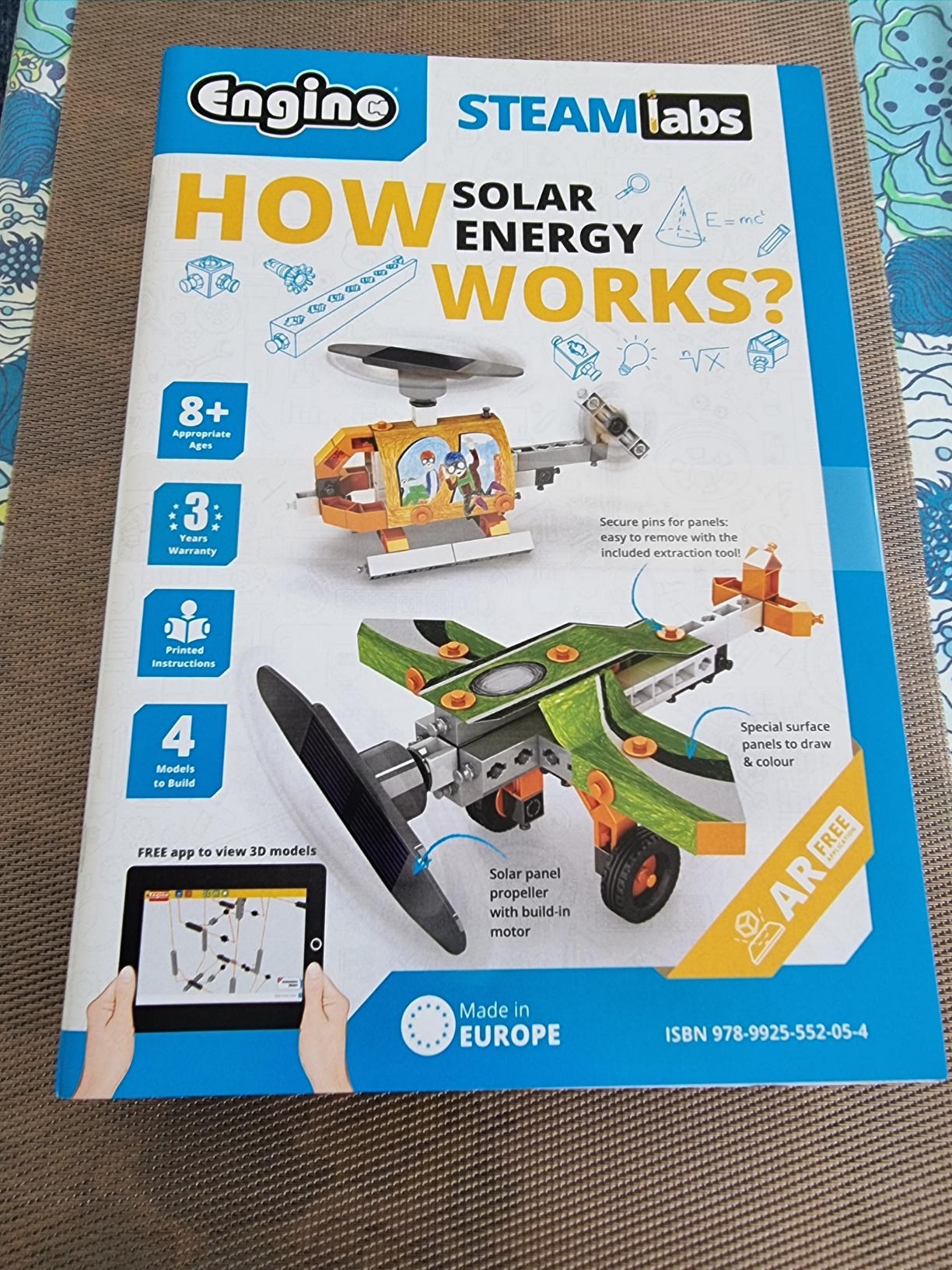 It's quiet a fun item as the box comes wrapped ina magazine style booklet that allows kids to learn all about the possibilities of solar energy and the benefits of eco thinking while building actual solar-powered models and discovering what makes them work. It has fun facts, as well as instructions and is easy to read. Of course there is also and app you can download with extra access to other 3D models you can build which makes this more than the original toy.